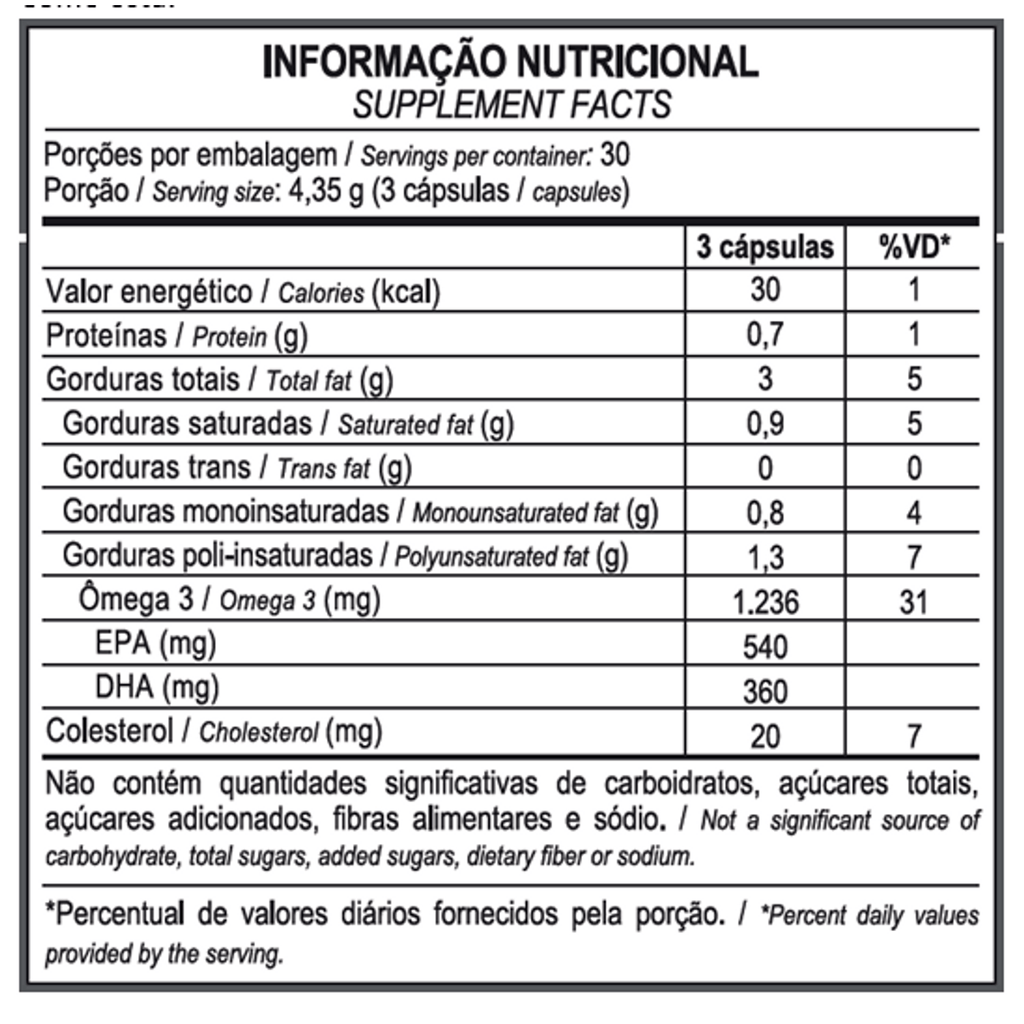 CONTÉM DERIVADOS DE PEIXE E PODE CONTER SOJA, LEITE, OVOS, AMENDOIM, AMÊNDOA, AVELÃS, CASTANHA-DE-CAJU, CASTANHA-DO-PARÁ, MACADÂMIAS, NOZES, PECÃS, PISTACHES, PINOLI, CASTANHAS, CRUSTÁCEOS (KRILL E CARANGUEJO), TRIGO, CENTEIO, CEVADA, AVEIA E SUAS ESTIRPES HIBRIDIZADAS E SEUS DERIVADOS. |