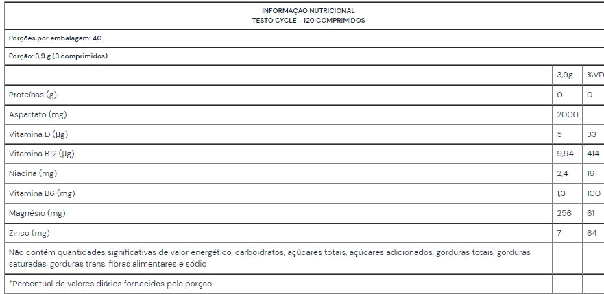 Testo Cycle foi desenvolvido com o ácido aspártico (2000mg/dose), associado ao zinco, magnésio, vitaminas B6, B12, D e niacina.